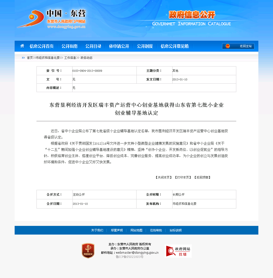 东营市;垦利县;经济开发区;瑞丰资产运营中心;创业基地;小企业;创业辅导;基地认定